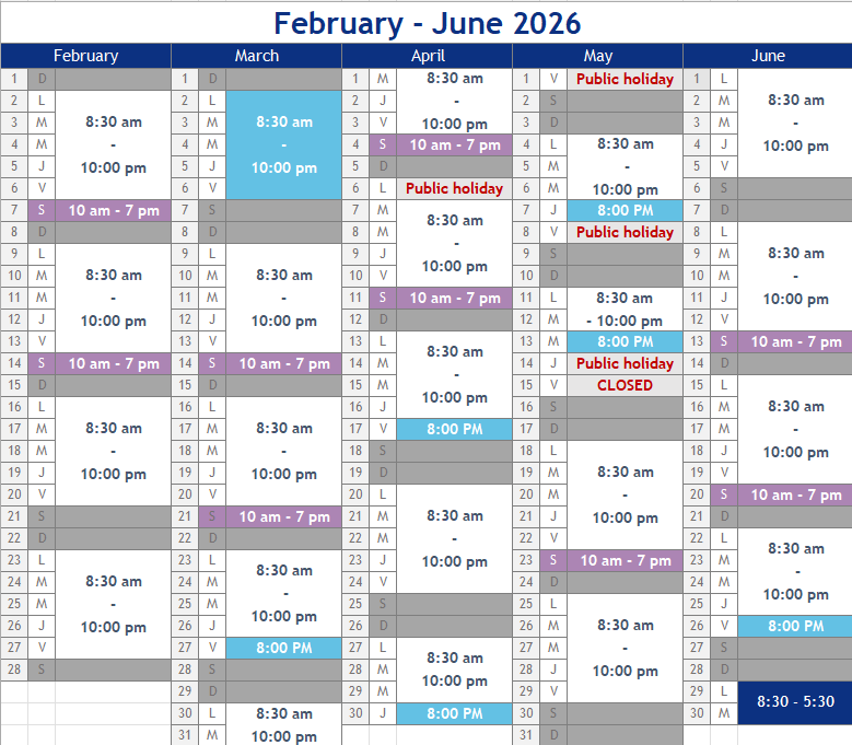 Opening hoursHomeVisitor informationOpening hoursChange the contrastReduce textEnlarge textPartager sur FacebookPartager sur TwitterPrintYou can also consult our timetables on the applicationLibrary opening hourscalendarOccupancy