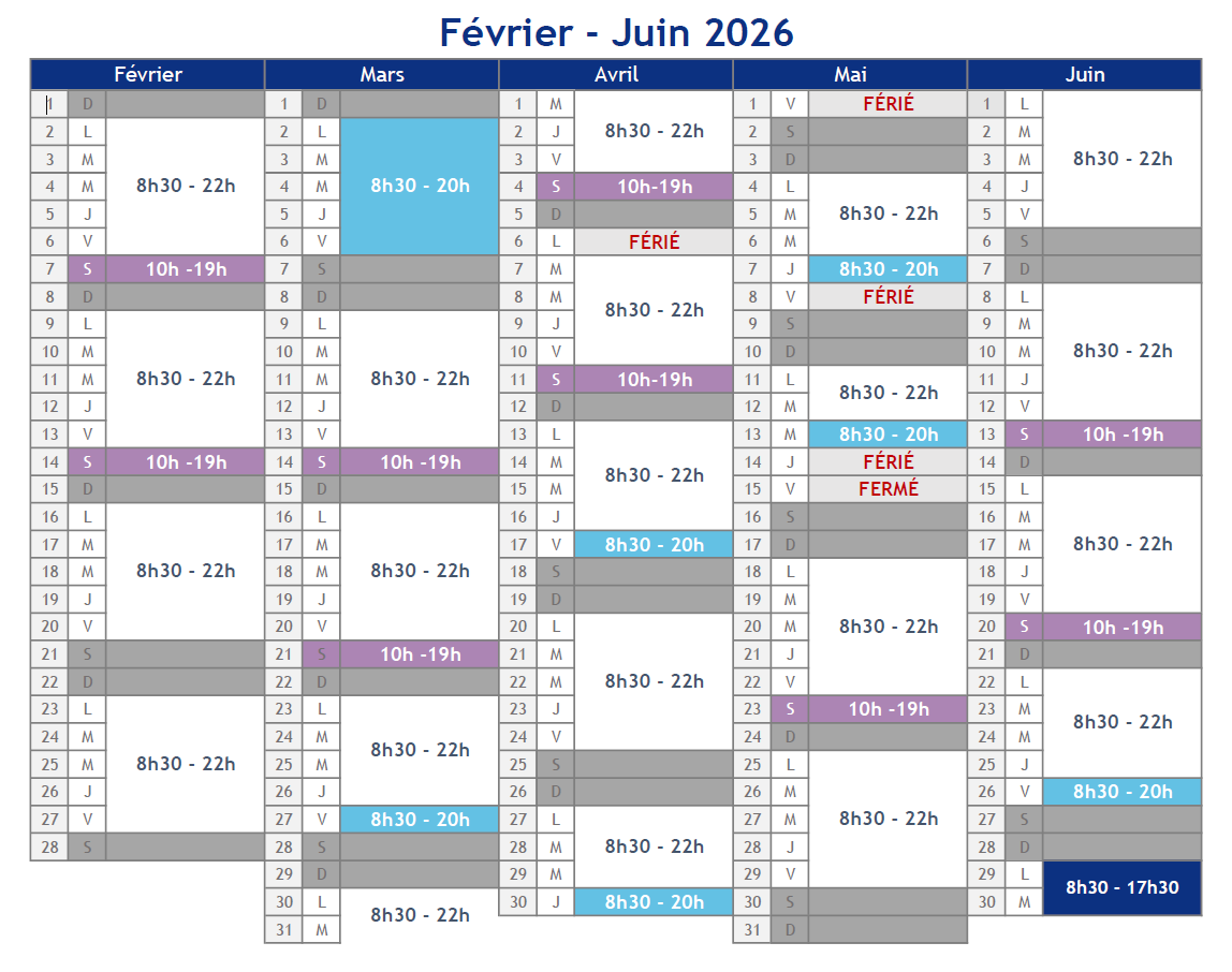 HorairesAccueilInfos pratiquesHorairesChanger le contrasteRéduire le texteAgrandir le textePartager sur FacebookPartager sur TwitterImprimerConsultez aussi nos horaires depuis l’applicationHoraires de la bibliothèque Taux d’occupation